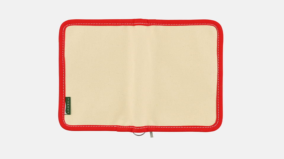 The coarse, off-white cotton canvas surface feels pleasant to the touch and is outlined with bright tomato-red piping. You can handle the cover as roughly as you would a sturdy tote bag, and never tire of its nice look as you carry it with you every day.