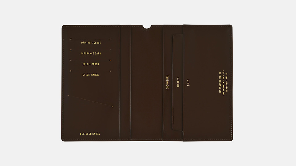 The shape has been simplified into a rectangle with no prints or labels on the outside so as to accentuate the beauty of the leather itself.