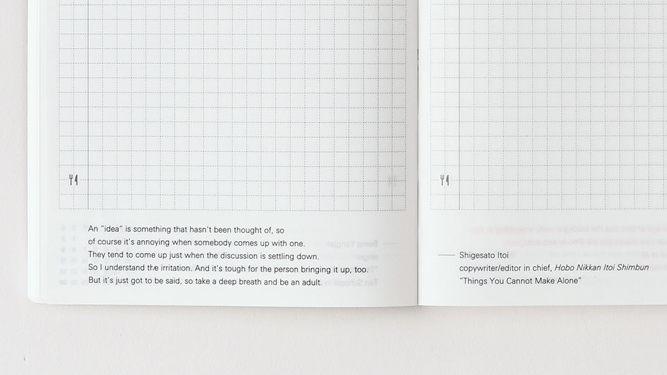 From the heartfelt to the humorous, the Hobonichi Techo includes quotes specially chosen from its parent site, the Japanese web magazine Hobo Nikkan Itoi Shimbun. Each two page spread contains a single quote.