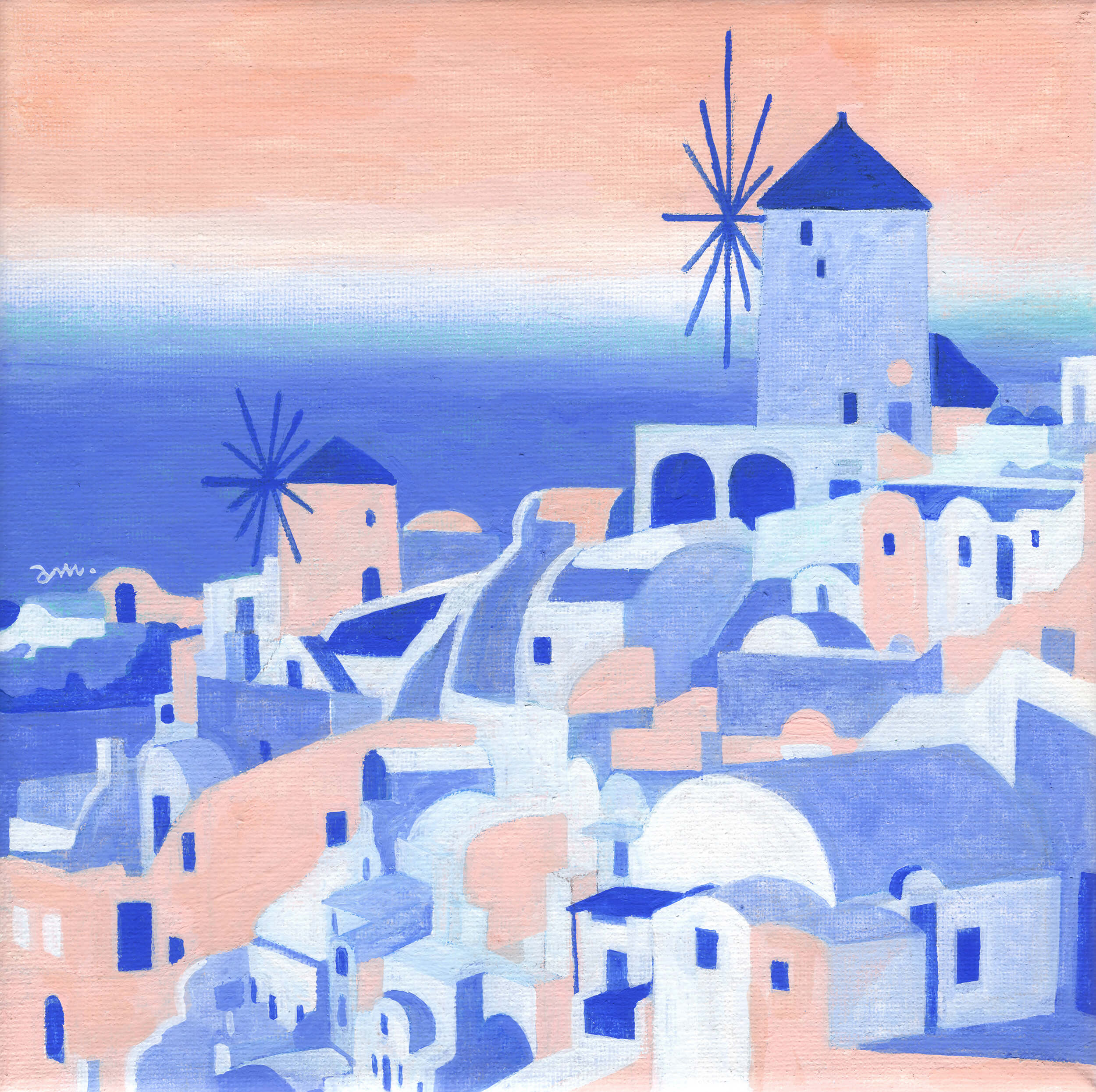 この島のランドマークともなっている夕陽に染まるイアの街は、