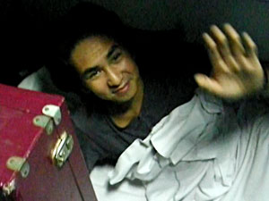大きなシタールをかかえた日本人一行を