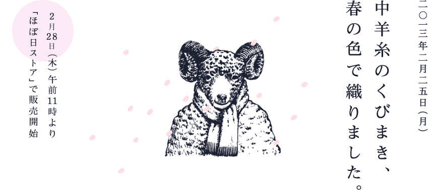 | 芯にあたたかなウール、外側にさらりとしたコットン。 ふたつの天然素材を組み合わせた「中羊糸」で織った 3つのサイズの「ほぼ日のくびまき」、 おまたせしました、新色をくわえての再販がきまりました。 たっぷりぜいたくにまくことができる「ストールサイズ」、 透け感のある、ボリュームたっぷりの「ふわふわロング」、 弾力とやわらかさを兼ね備えた定番の「マフラーサイズ」。 いずれも、肌にふれるところはコットンですから、 ちくちくしないし、冬でも静電気が起きにくい。 そして芯になっているウールが、 じんわり、ぽかぽかと、からだをあたためます。 暦のうえでは春ですけれど、まだまだ風のつめたい季節、 「ほぼ日のくびまき」で、あたたかいおでかけをたのしんでくださいね。 |