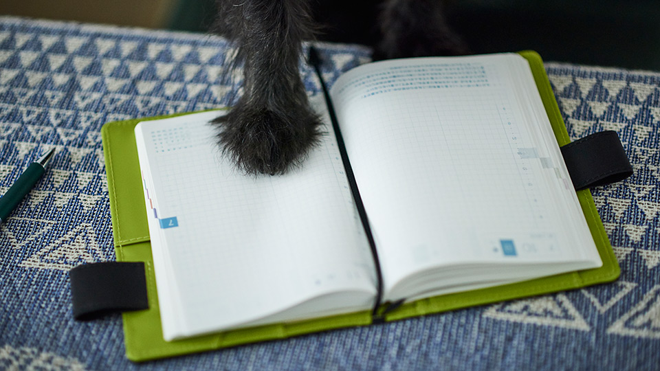 Black returns as a regular in our cover lineup, now with a touch of pistachio green. The lustrous, handsome sheen of the black cover opens up to reveal the bright green interior, which adds a little fun to every day you use it.