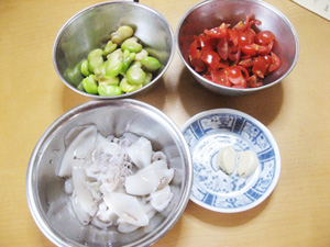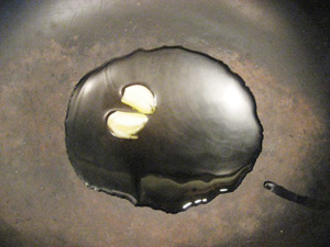 (3)ニンニクの香りが出たら、ヒイカを入れる。