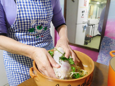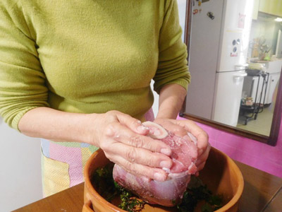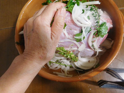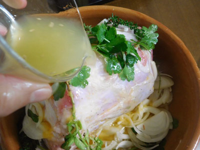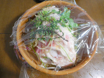 (1)肉を取り出して香草を取り除く。