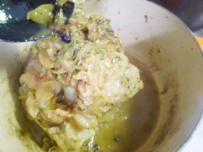 (4)肉のつけ汁と香草などを入れ、