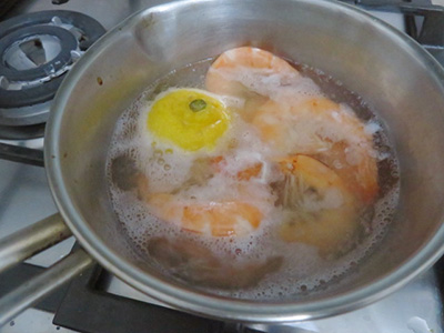 沸騰させてエビを入れ、