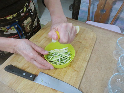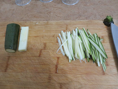 (2)ズッキーニを棒切りにする。