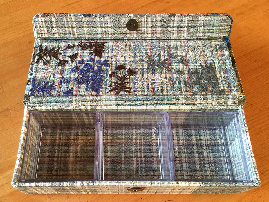 可愛らしいレースの柄が入った生地で作られた箱です。