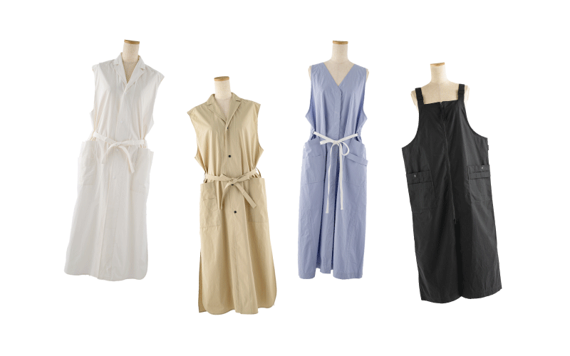 3種類のエプロンとなりました。 - 新作のシャツエプロン(ホワイト、ベージュ)、