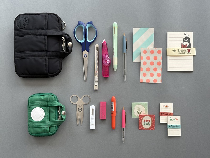 左から順にはさみ、カッター、修正テープ、ペン2種類、ポチ袋、便箋が並んでいます。