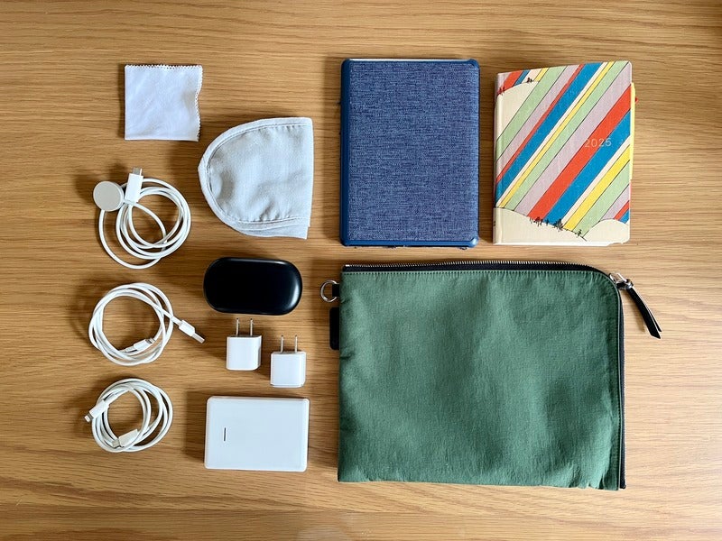 メガネ拭き、イヤホン、モバイルバッテリー、