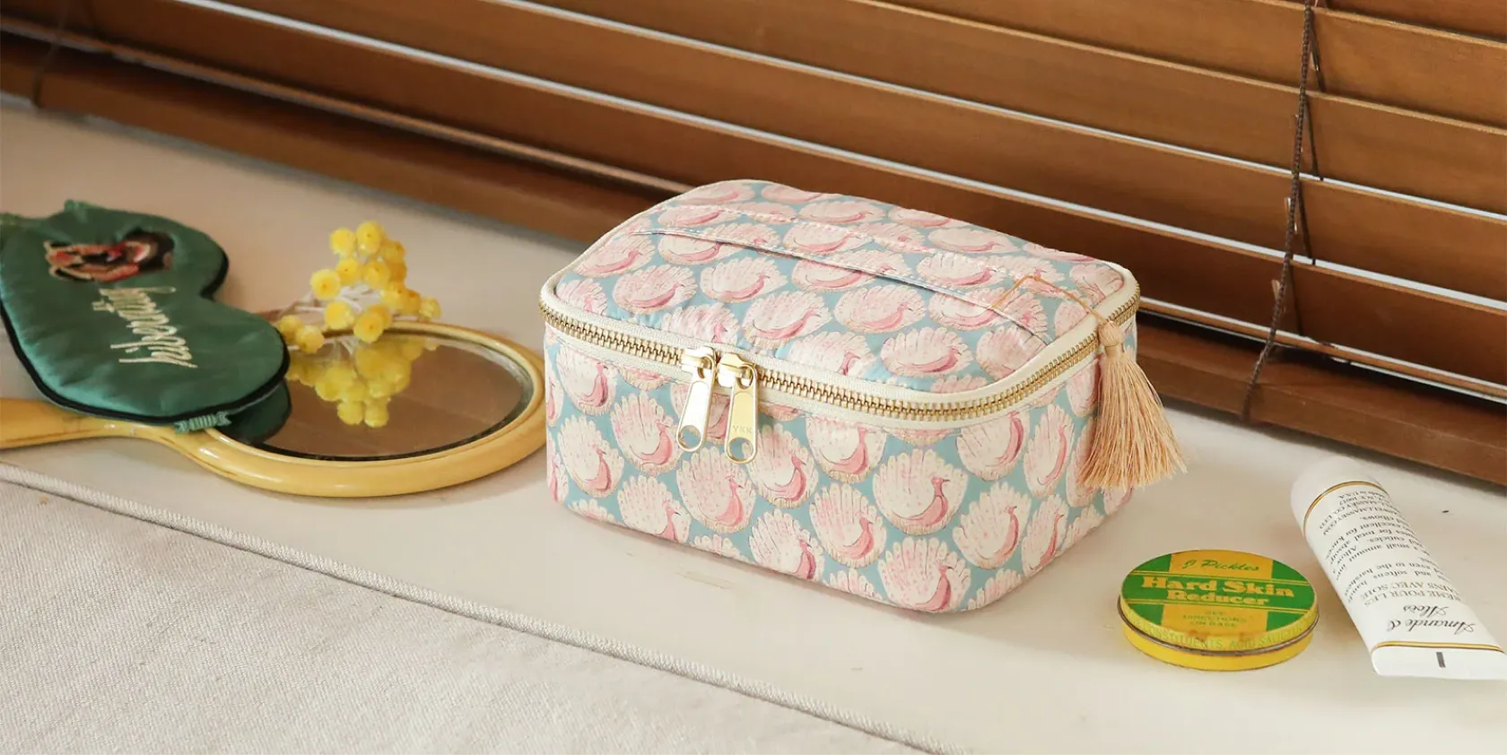 This is a box-shaped pouch with a handle. Use it to store items that have some thickness to it and is bulky, or to line up your collection of small items.