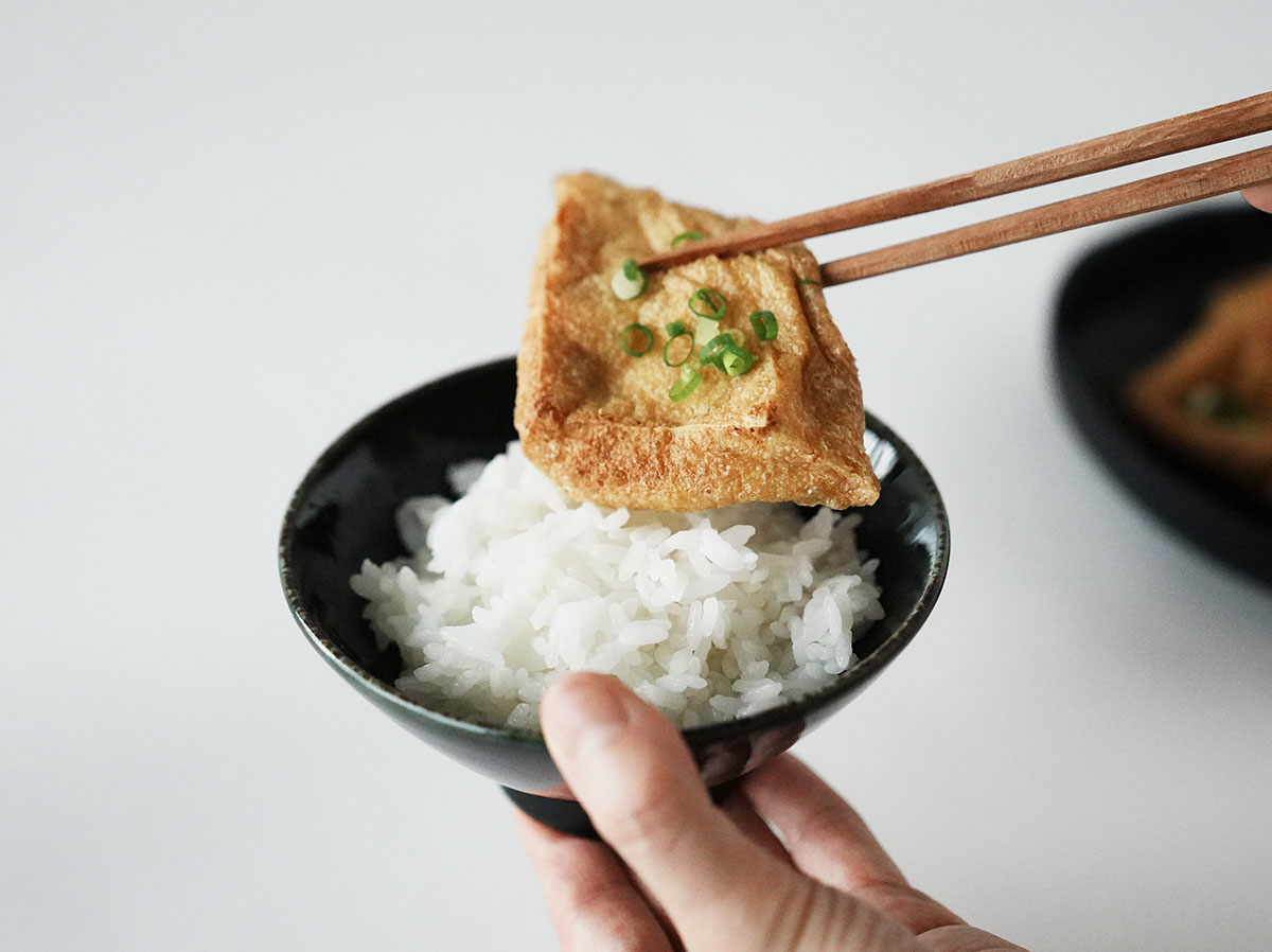 醤油ベースのたれを絡ませた、味つきの油揚げです。