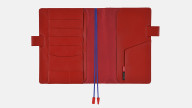 The pen holder is designed to perfectly fit the 12.2mm (0.48”) diameter Jetstream pen offered as a free bonus gift with select Japanese-version Hobonichi Web Shop products. Pens with certain shapes and materials may be difficult to pull through the holder. The holder can fit pens up to 13.5mm (0.53”) in diameter.