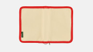 The coarse, off-white cotton canvas surface feels pleasant to the touch and is outlined with bright tomato-red piping. You can handle the cover as roughly as you would a sturdy tote bag, and never tire of its nice look as you carry it with you every day.