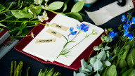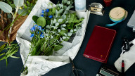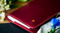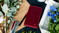 The stitching in this cover uses bright orange threads that stand out against the bordeaux (wine-colored) leather. The embroidery depicts a flower to represent Henry Cuir designer Henri Beguelin’s love of nature.