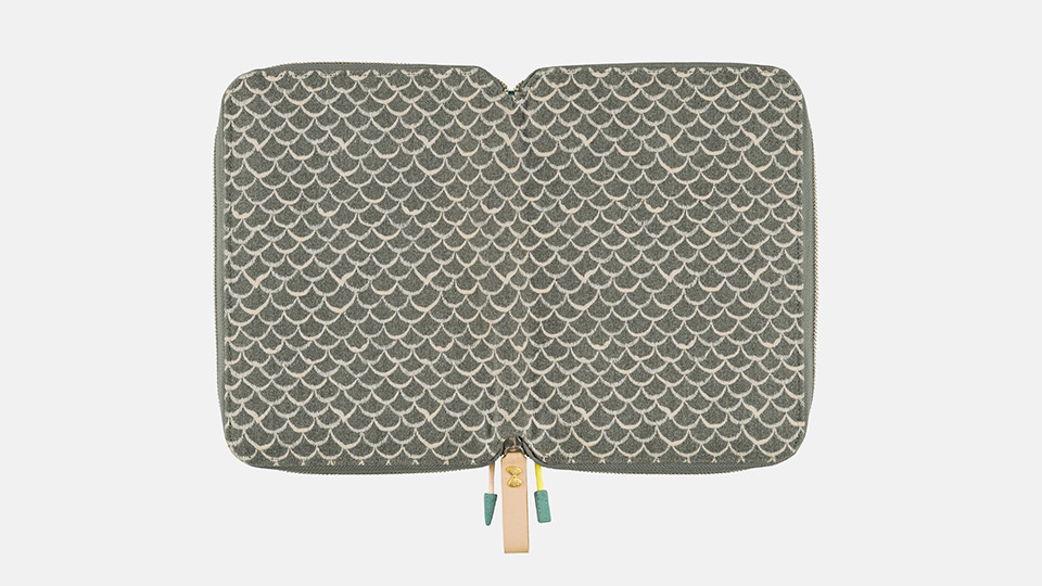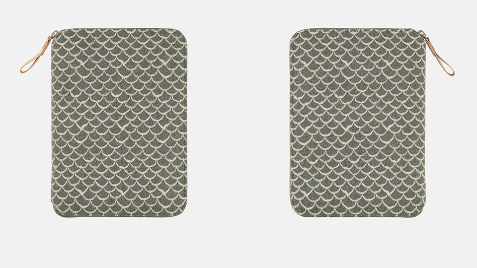 This pattern, resembling fish scales as small arcs, is carefully embroidered in waves across the material. Look closely and you’ll see that every arc has a slightly unique curve, and the embroidery varies in thickness. The embroidery protrudes from the surface of the cover for a texture that’s nice to the touch. The chic, timeless color scheme of white and gray is a handsome fit for both men and women.