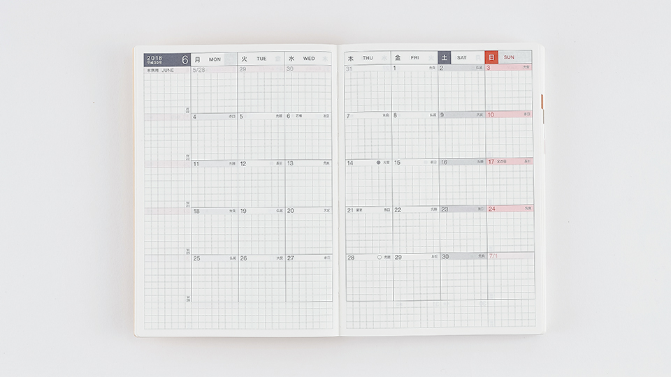 In the Hobonichi Techo Original book, you can choose between a Monday-start week (gray label) or Sunday-start week (red label) for the monthly calendar.