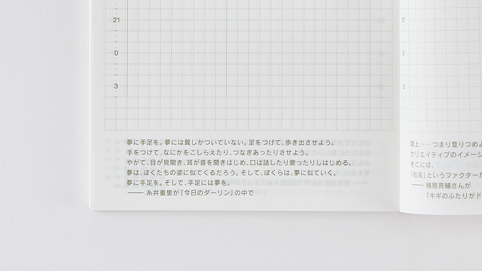 The Hobonichi Techo includes quotes specially chosen from its parent site, the Japanese web magazine Hobo Nikkan Itoi Shinbun. Each daily page has a quote in Japanese.