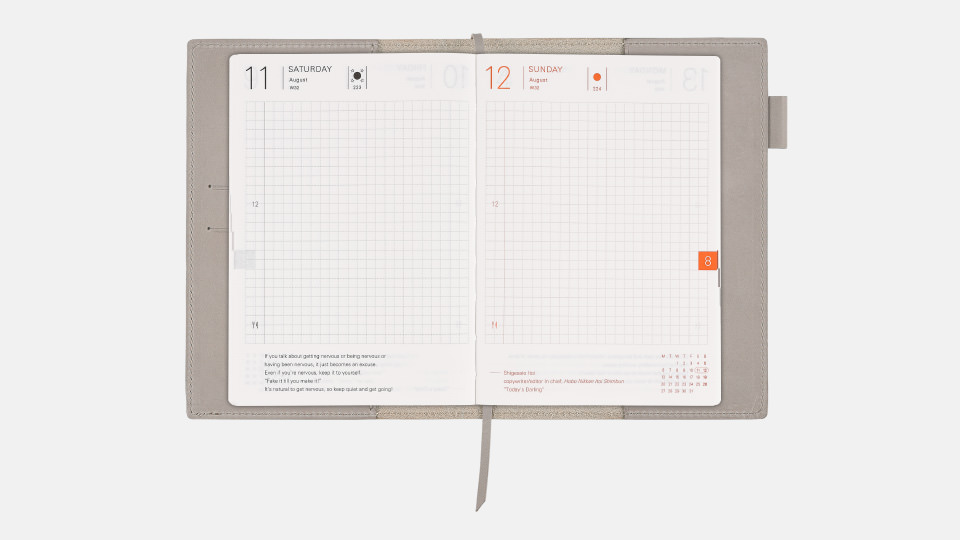 This simple cover made with soft, quality leather is produced by Arts&Science, a brand lead by Sonya Park, who is also the creative director of the Hobonichi Techo Planner. Tanned in Italy, this leather enchants with intense color. Argilla, meaning clay in Italian, is a warm light gray with a beige tint.
