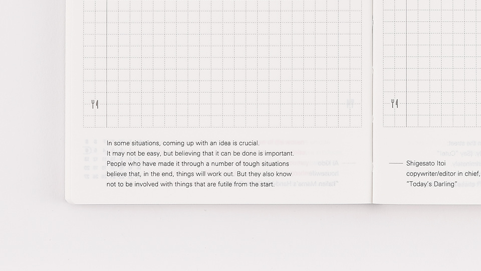 From the heartfelt to the humorous, the Hobonichi Techo includes quotes specially chosen from its parent site, the Japanese web magazine Hobo Nikkan Itoi Shinbun. Each two page spread contains a single quote.