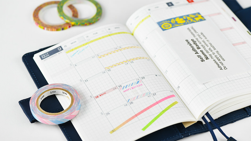 The tape comes in 2 sizes, 3 mm and 6 mm. The 3 mm tape comes in a set of 2 and fits into the pocket of the Hobonichi Techo cover. The 6 mm tape comes in a set of 3 and can be stored in the expandable mesh pocket in the Zippers series covers.
