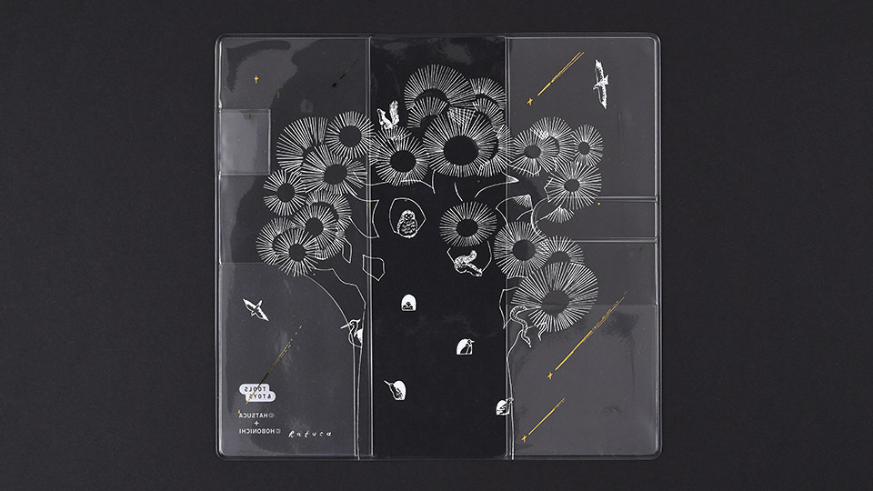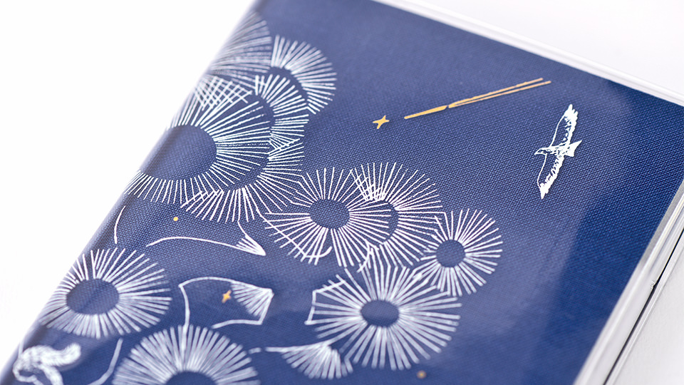 “Circling Stars” is an illustrated version of this cover designed by illustrator hatuca. The drawing depicts a beautiful night sky filled with shooting stars, with birds, owls, and squirrels gazing up from below. Even a snake is crawling up the tree for a view. The stars are printed with gold foil to recreate their sparkles in the sky.