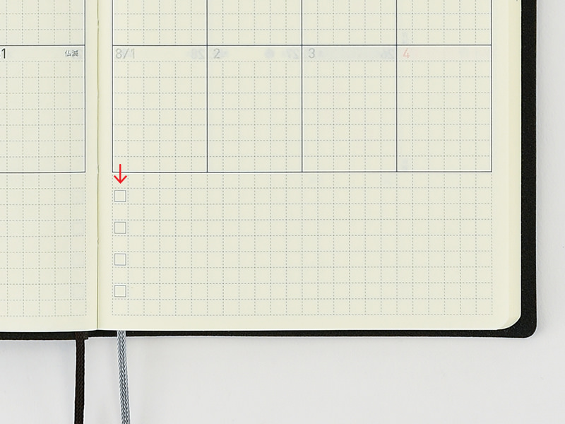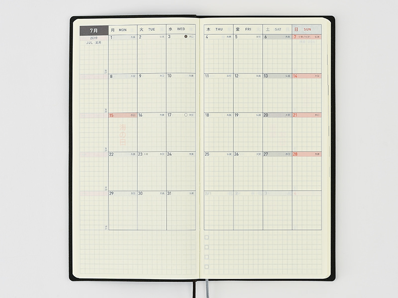 The monthly calendar is ideal for managing schedules. The graph paper design is lightly printed to make it easier to write in your plans and take notes in an even line. The subdued gray and red allow for high visibility when writing in the calendar.