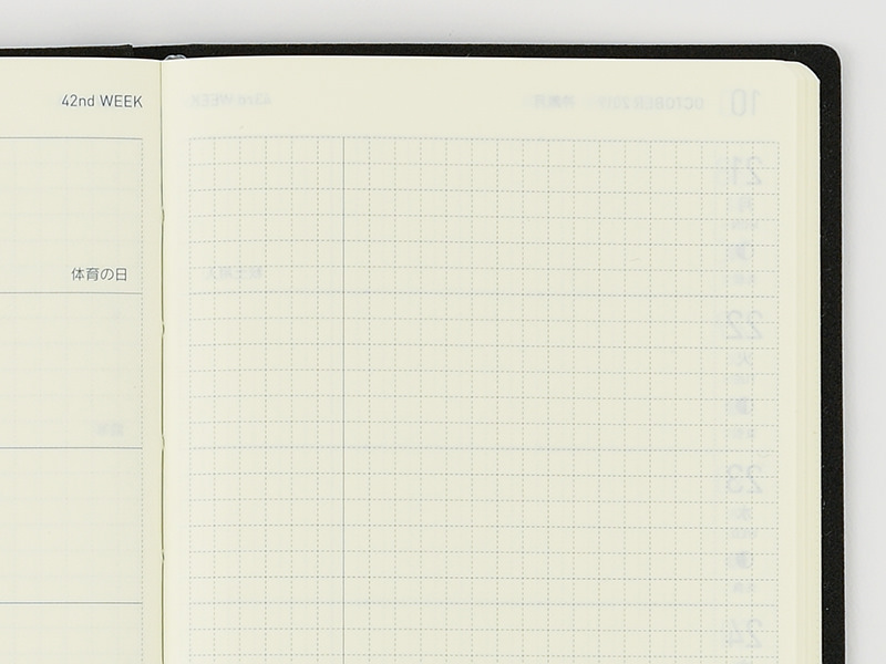 The right page on each weekly spread contains blank graph paper to give full reign to users when drawing out plans or writing out schedules. You can also draw lines across the page to correspond with each of the 7 days on the left to give yourself more writing room. At 3.55 mm, the graph paper’s grid is slightly smaller than that of the daily planners.