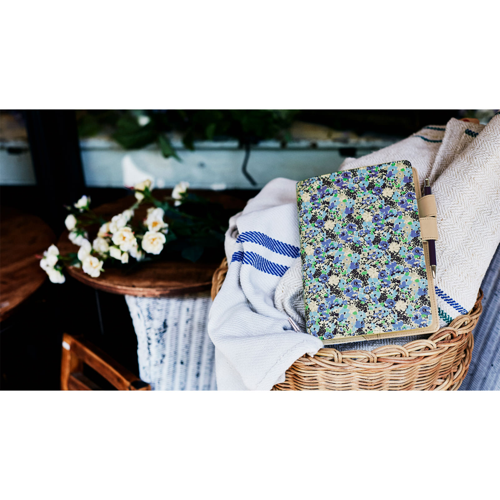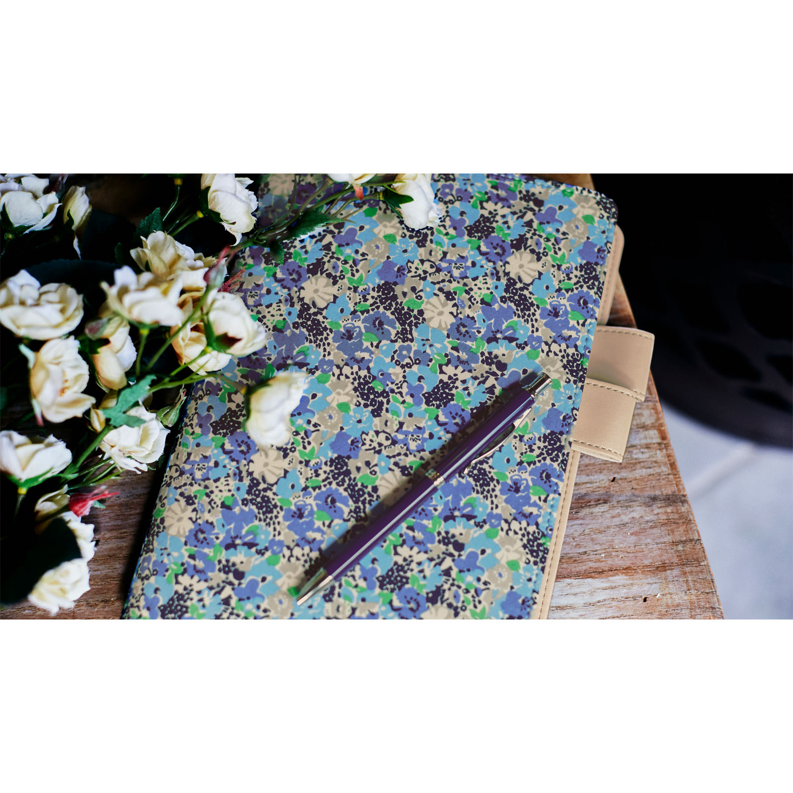 The beige faux-leather interior and pen holder complete the cover’s elegant look.