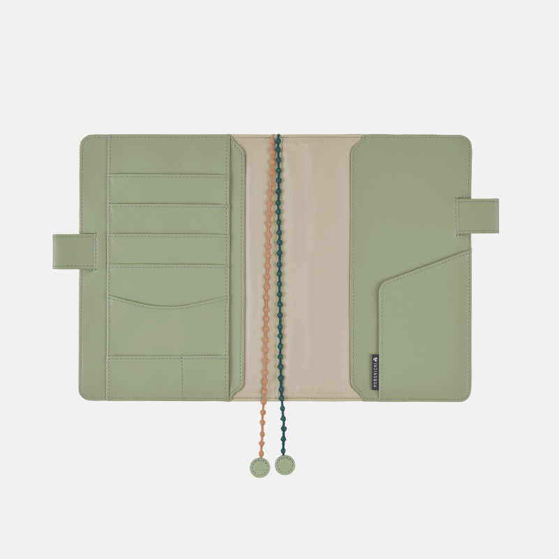 The bookmarks of this cover use original mina perhonen lace straps. If you see any loose threads, we recommend refraining from pulling on it and instead tucking it between other woven threads.