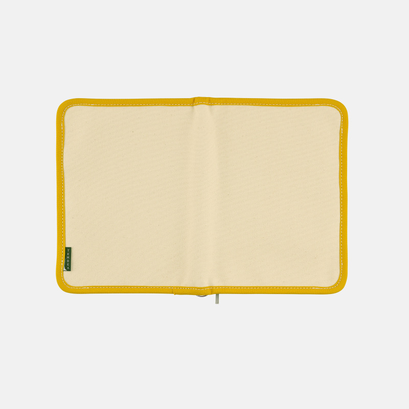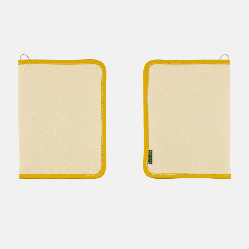 The coarse, off-white cotton canvas surface feels pleasant to the touch and is outlined with subtle mustard-yellow piping. You can handle the cover as roughly as you would a sturdy tote bag, and never tire of its nice look as you carry it with you every day.
