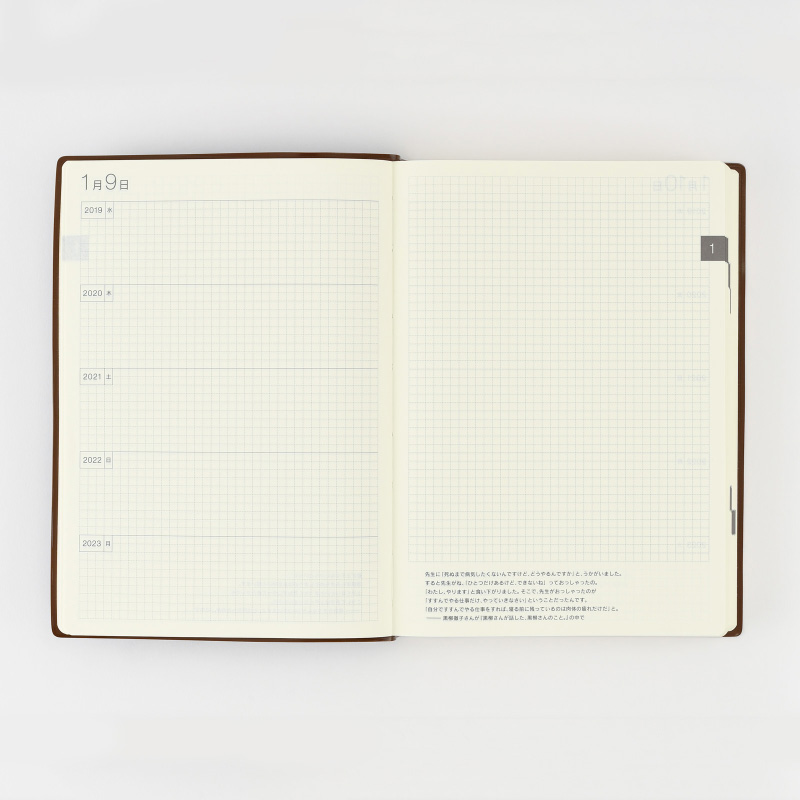 By popular demand, we’ve added the A5 size “Large 5-Year-Techo” to our lineup this year. The book has pages dated across a 5-year span.