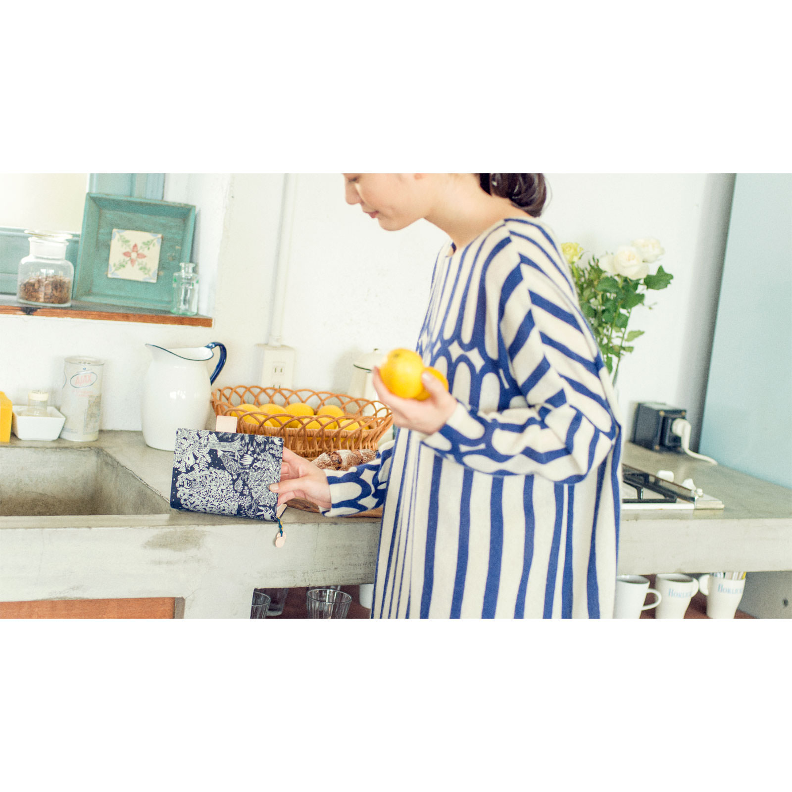The charm in this design comes from the light, fountain-pen feel of the art, which was drawn on a whim without planning anything out beforehand. The dark navy cover material is made of cotton.