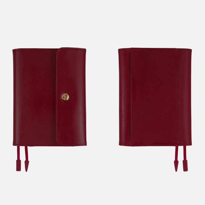 This trifold red leather cover has a mature and distinguished look. The cover clasps shut with a shimmering gold button and can also be carried as a fashionable clutch bag.