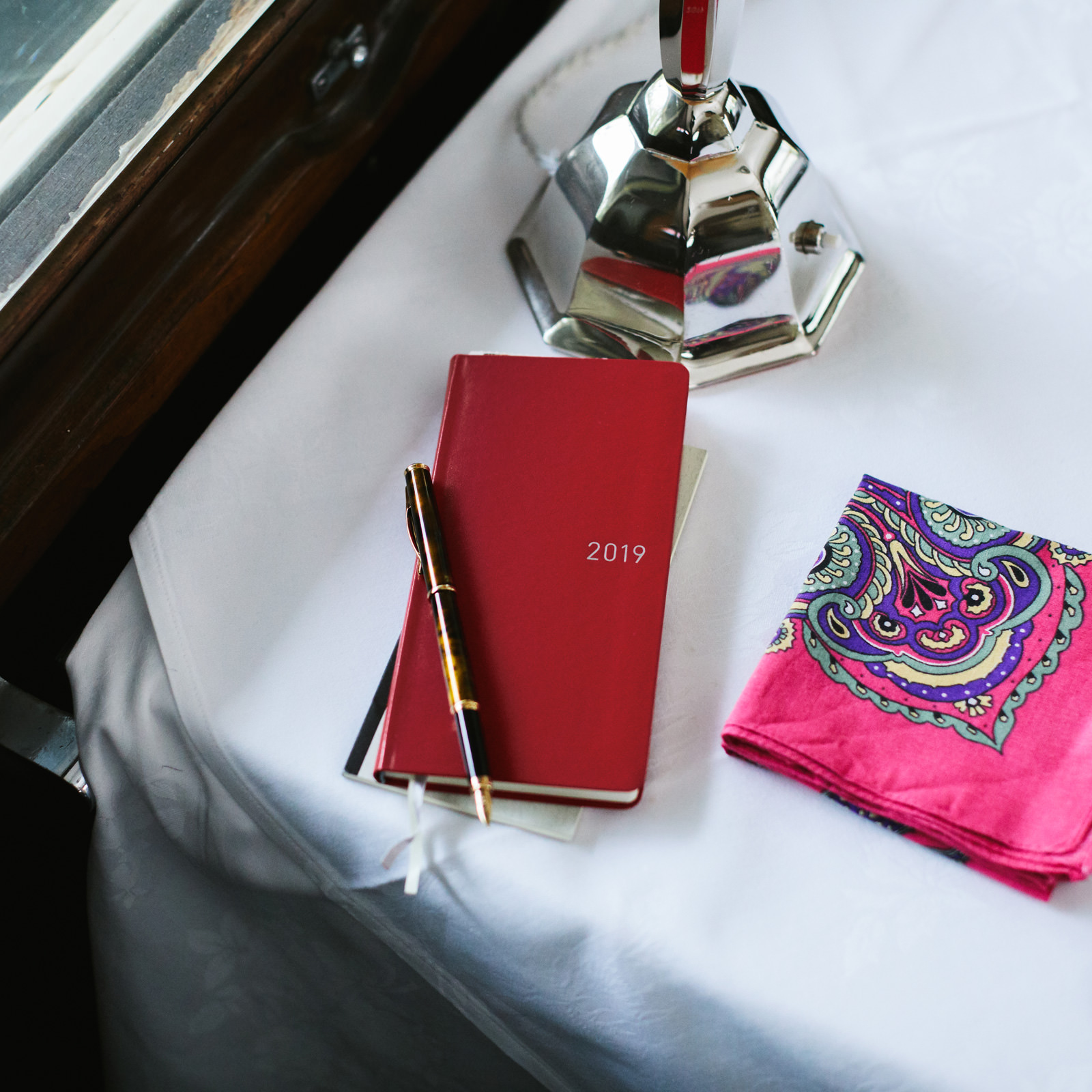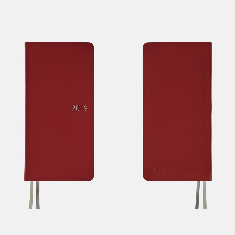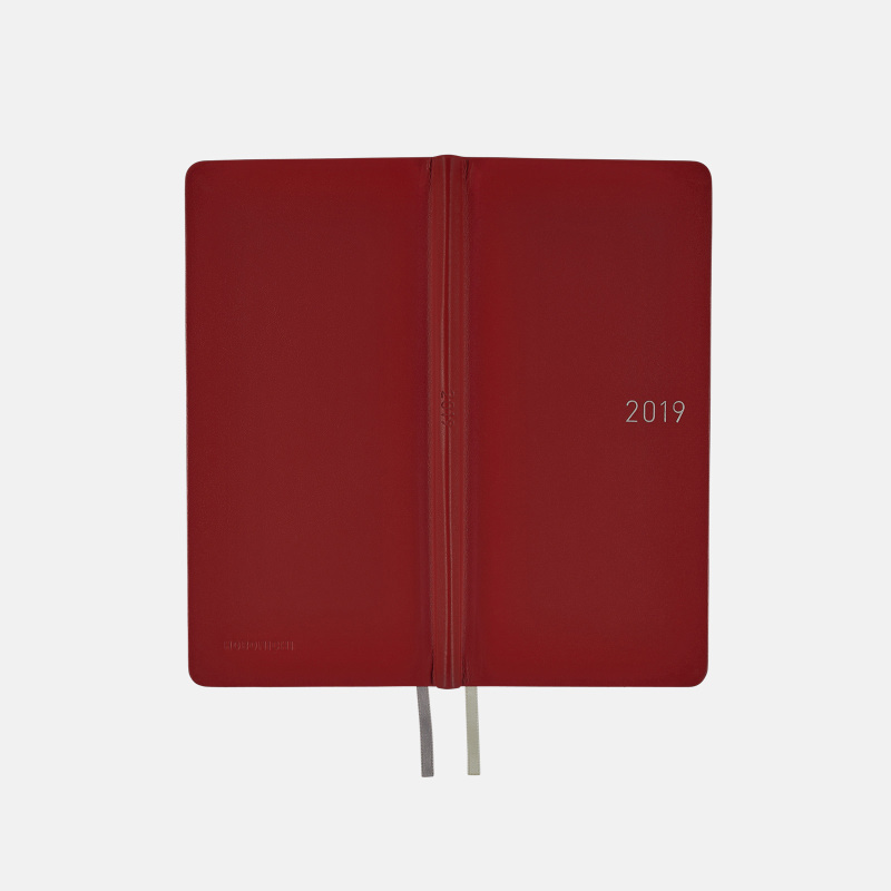 This 2019 edition leather Weeks book features durable and comfortable cow leather for the attached cover. The shiny satin bookmark ribbons and headband on the book spine establish a slightly more elaborate construction than usual.