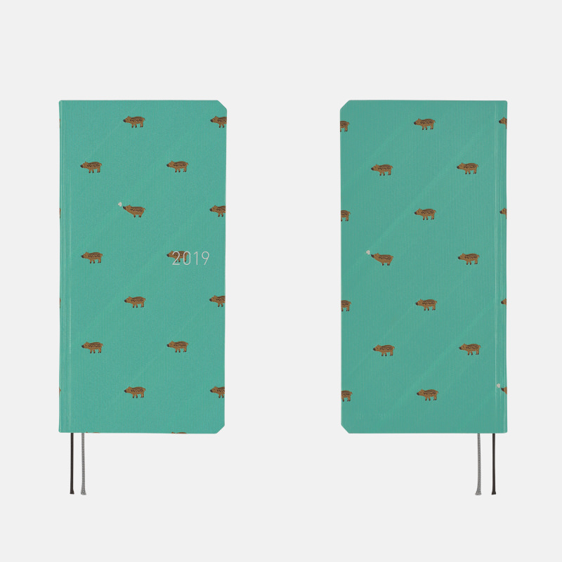 Boar piglets lined up along a refreshing mint blue background give the cover its unique look. Their cute, round little bodies and the stripes down their back are woven into the fabric, just like on a patterned necktie.