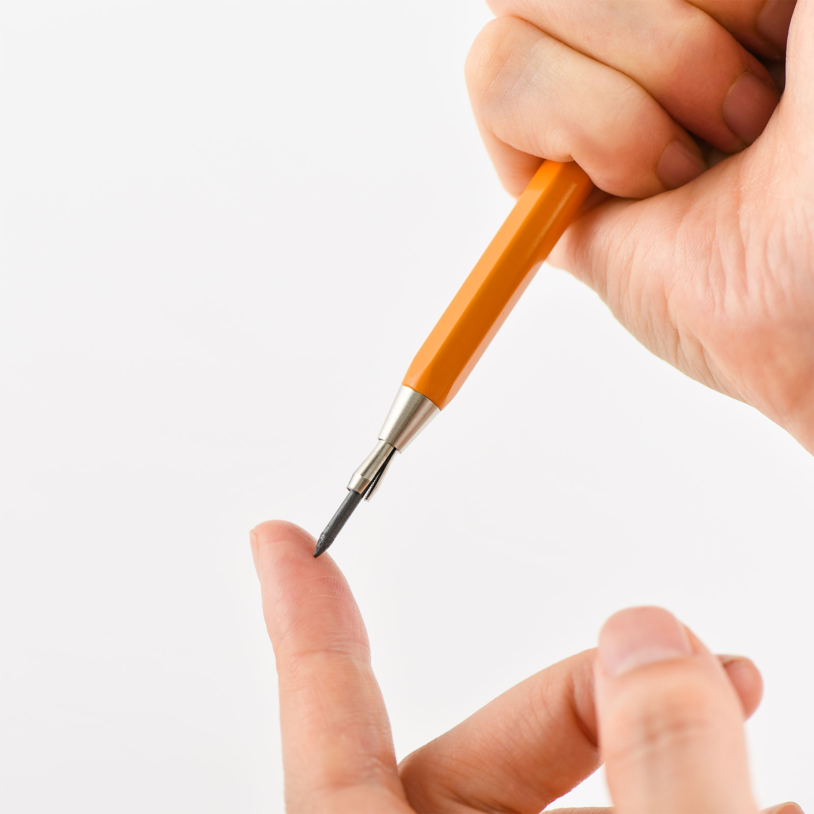 To extend the lead, hold down the knock and pinch the lead to adjust to your preferred length. To retract the lead, hold down the knock and gently push the lead back in. To fill with more lead, insert it from the writing tip, not from the top. You can use it with 2.0 mm lead from any manufacturer. (It comes with one lead upon purchase.)