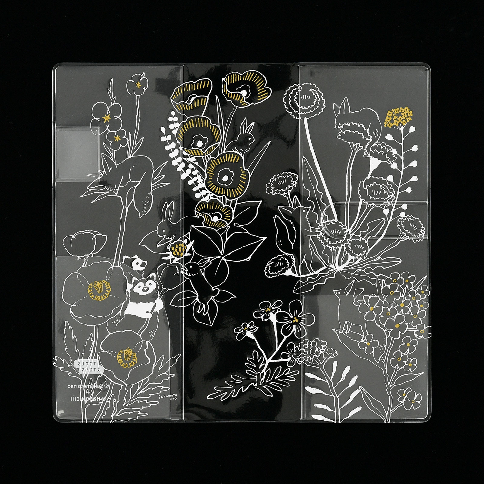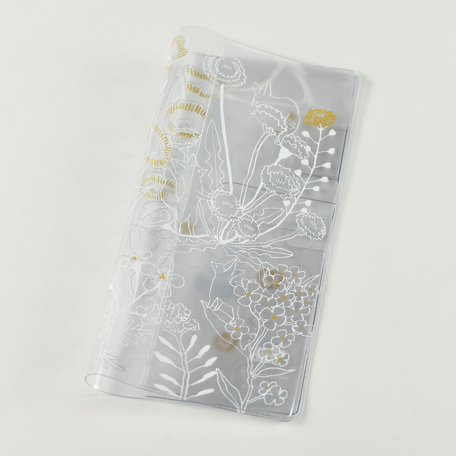 This Clear Cover features an illustration by Nao Sakamoto, which depicts a lush field blooming with various flowers, where tiny creatures like foxes or rabbits are frolicking about, playing or taking a nap. The gold printed flowers give a touch of elegance to any cover that you put this Clear Cover on.