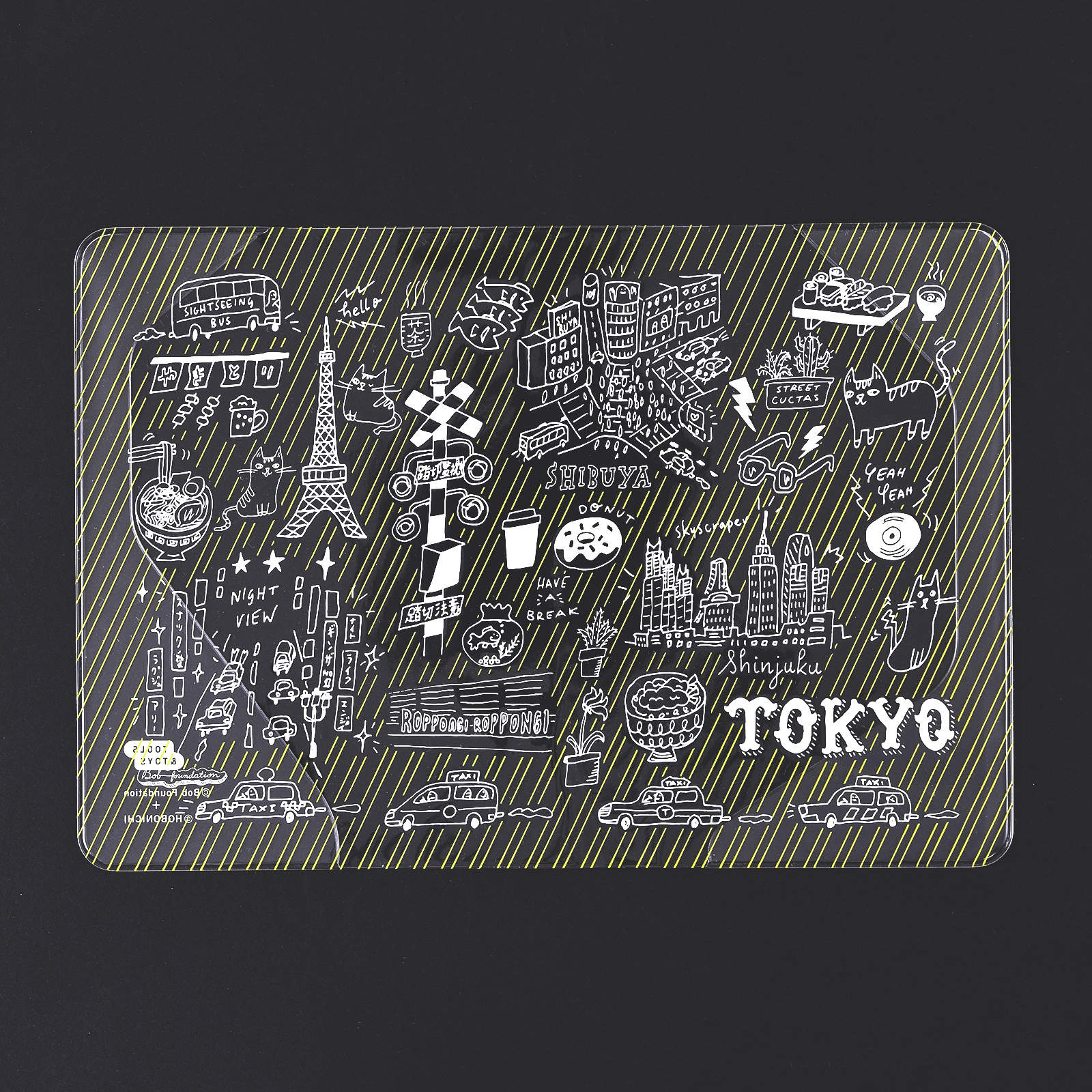 This design by creative design group Bob Foundation depicts a lively Tokyo scene with sushi, ramen, Tokyo Tower, railroad crossings, Shinjuku’s stretch of skyscrapers and the famous Scramble Crossing in Shibuya.