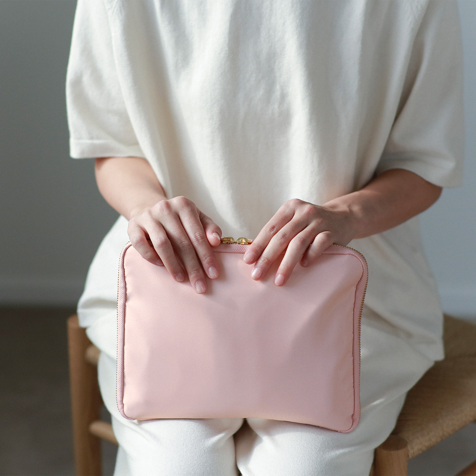 Sugar Rose features a delicate pastel pink, reminiscent of confectioneries. High-quality polyester bonded with resilient urethane makes the taut, lustrous material light and soft to the touch. The pastel green of the interior completes the pouch’s gentle look.