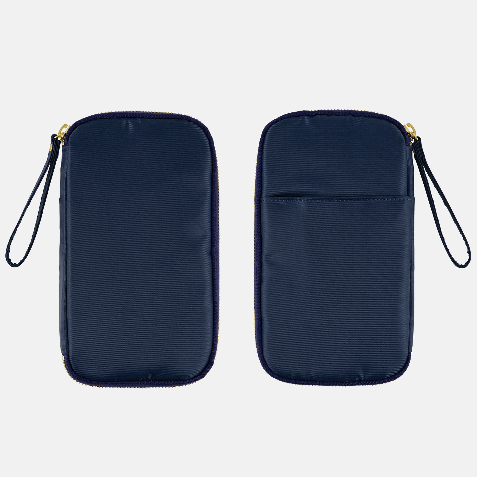 High-quality polyester bonded with resilient urethane makes this chic, navy pouch light and soft to the touch. The deep sky blue of the interior is a refreshing complement to its taut, lustrous exterior.