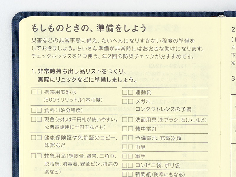 This page contains a checklist of items to have ready in case of an emergency. There is also a space to list nearby evacuation zones (common in Japan), emergency contact information and topics discussed between family and friends.