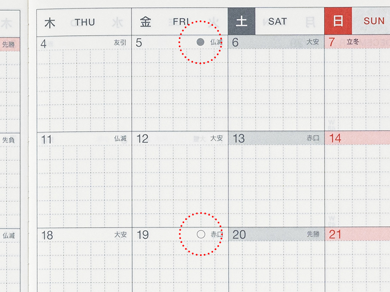 The calendars include icons depicting new moons (●) and full moons (○). (While the moon phase is the same across the world, the exact dates the moon phases land on are listed in Japan time.)