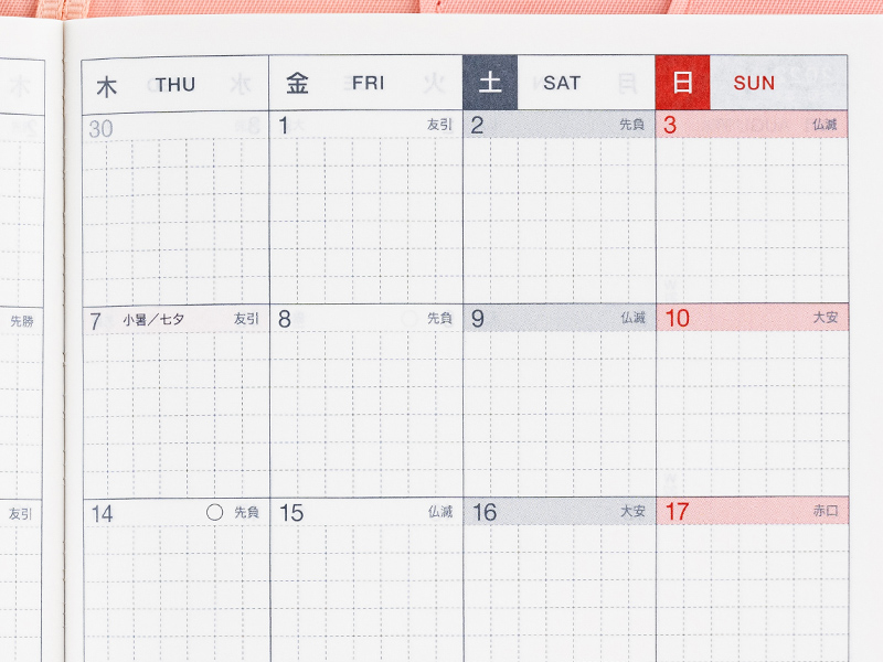 The monthly calendar days are labeled with rokuyo, a cycle of six days said to predict good or bad fortune that day. The labels are commonly found on Japanese calendars and used to plan weddings and funerals.