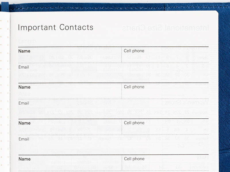 This page provides a place to keep up to 7 entries of often-used contacts and emergency contact information.