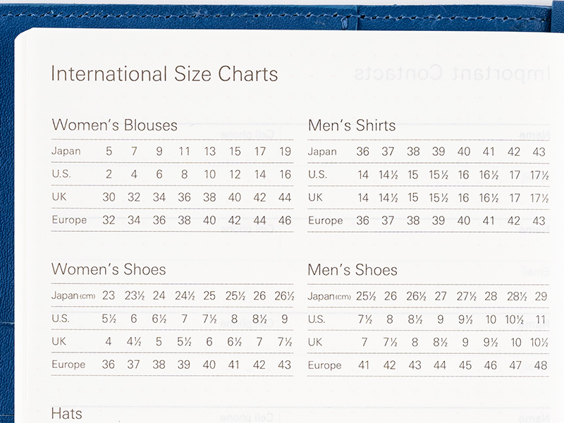 Comparison charts for Japan, the US, the UK, and Europe include items such as clothing, shoes, hats and rings.