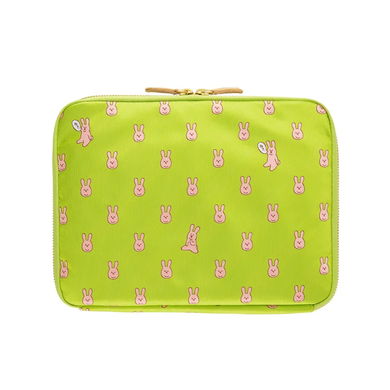 This pouch is dotted with Suki-Usagi, a popular character created by manga artist, illustrator, and animator Q-rais. The material uses the same textured, shiny fabric used in neckties, and Suki-Usagi is featured with a variety of charming expressions and poses. The background color is a vivid lime green.