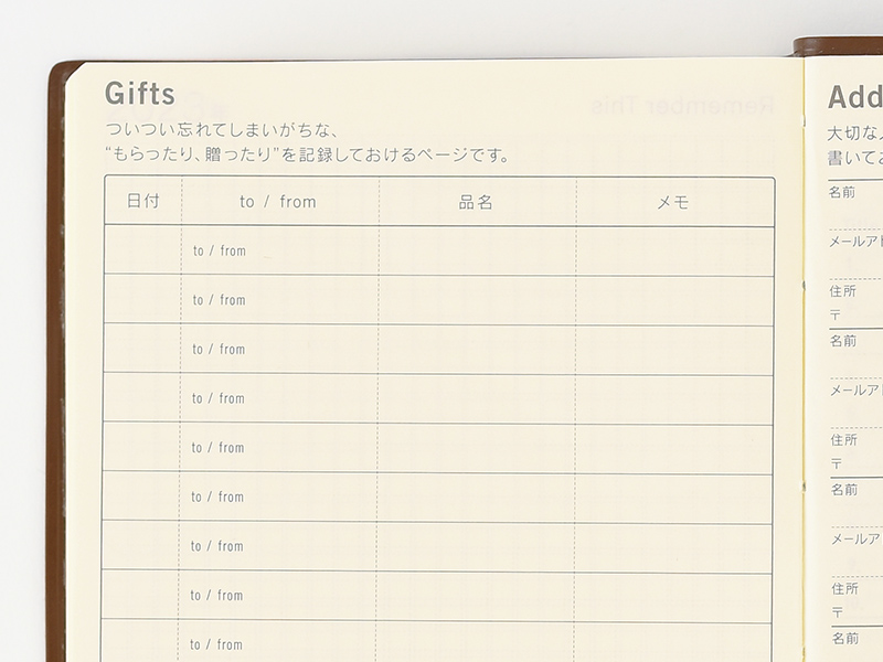 Record the presents you’ve given or received in the Gifts page so you don’t forget who gave what to who and when. This is also helpful for thank-you cards. There are spaces for 17 entries in the A6-size book and 40 entries in the A5-size book.